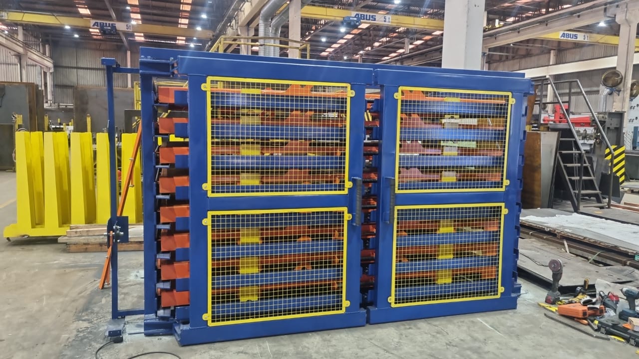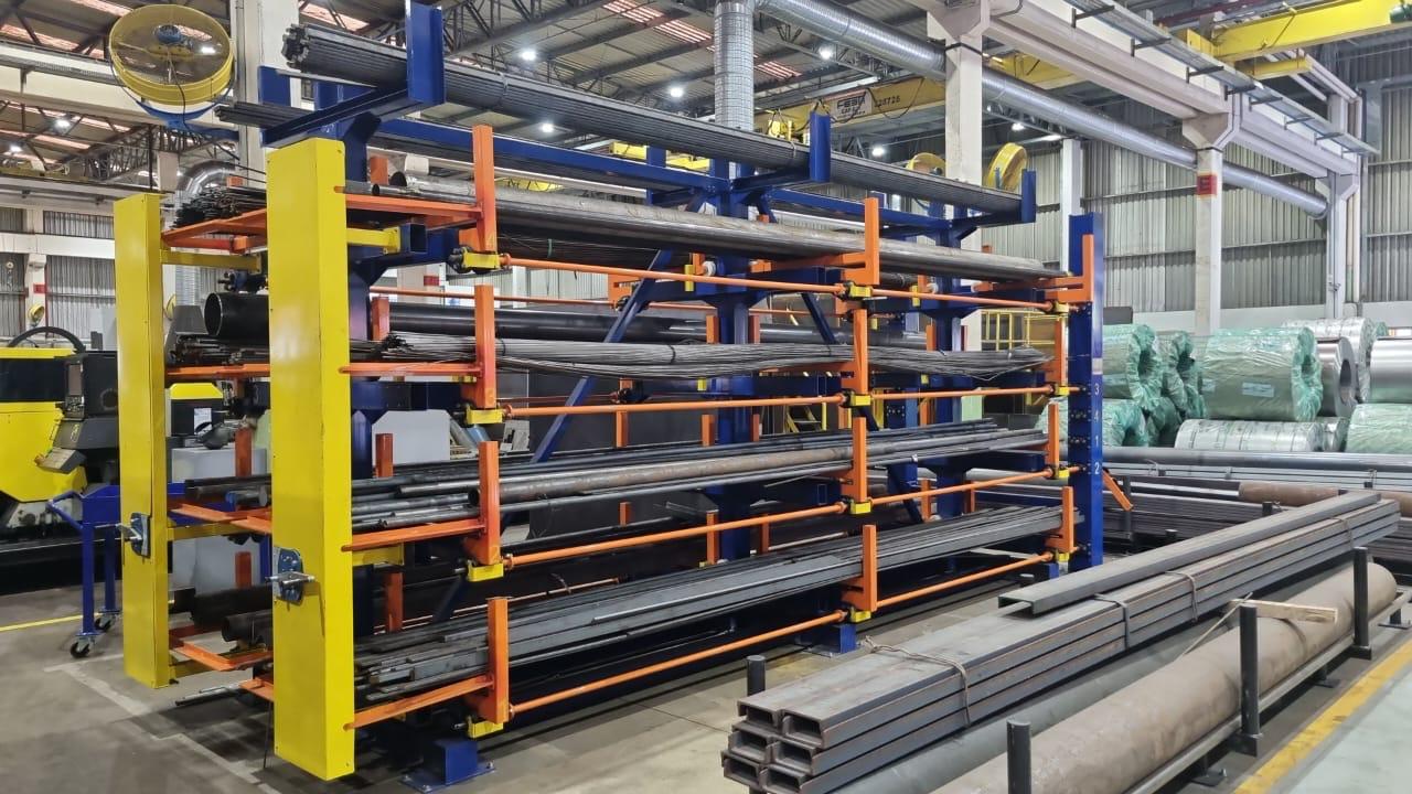Prateleiras e gaveteiros indústriais para chapas, amarrados de ferro, tarugos, esquadrias.